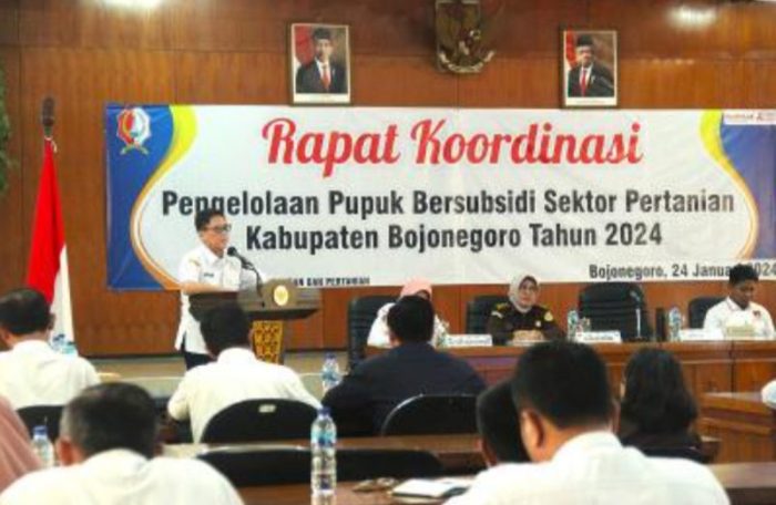 SURABAYATODAY.ID, BOJONEGORO – Pemerintah Kabupaten Bojonegoro melalui Dinas Ketahanan Pangan dan Pertanian (DKPP) menggelar Rapat Koordinasi Pengelolaan Pupuk Bersubsidi Sektor Pertanian Kabupaten Bojonegoro tahun 2024. Acara digelar di ruang Angling Dharma gedung Pemkab Bojonegoro, Rabu (24/1).