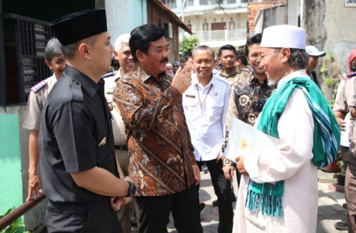 SURABAYATODAY.ID, SURABAYA – Wali Kota Surabaya Eri Cahyadi mendampingi Menteri Agraria dan Tata Ruang/Kepala Badan Pertanahan Nasional (ATR/BPN) Hadi Tjahjanto menyerahkan sertifikat tanah wakaf di Pondok Pesantren An-Najiyah Sidosermo, Surabaya, Rabu (31/1). Sertifikat tanah wakaf yang diserahkan sebanyak 11 sertifikat.