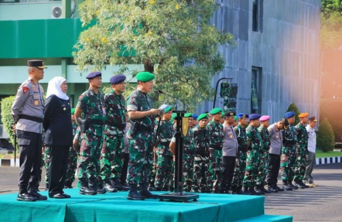 SURABAYATODAY.ID, SURABAYA – Apel gelar pasukan kesiapan pengamanan Pemilu 2024 di Jatim digelar di lapangan Makodam V Brawijaya, Kamis (1/2). Panglima Kodam V Brawijaya Mayor Jenderal TNI Rafael Granada Baay yang membacakan amanat Panglima TNI menyampaikan bahwa sebagai prajurit TNI harus mampu menjaga integritas dan profesionalitas.