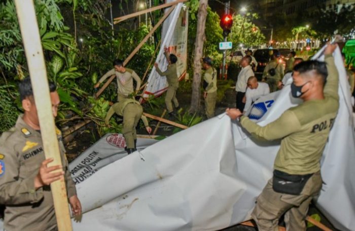 SURABAYATOFAY.ID, SURABAYA – Pemerintah Kota (Pemkot) Surabaya bersama Badan Pengawas Pemilu Umum (Bawaslu), dan Komisi Pemilihan Umum (KPU) Kota Surabaya menggelar operasi penertiban Alat Peraga Kampanye (APK), Minggu (11/2) dini hari. Sebanyak 750 personel dikerahkan dalam giat operasi penertiban APK.