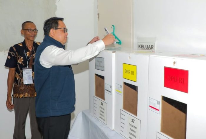 SURABABAYATODAY.ID, SURABAYA – Pelaksana Harian (Plh) Gubernur Jawa Timur Adhy Karyono menyalurkan hak pilihnya di Tempat Pemungutan Suara (TPS) 37 Kelurahan Dr. Soetomo Kecamatan Tegalsari, Surabaya, Rabu (14/2) pagi.