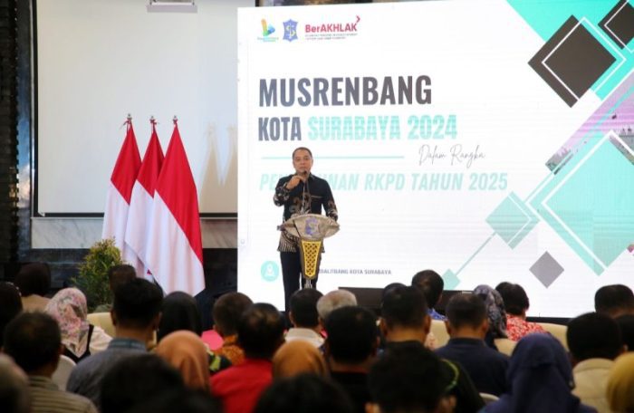 SURABAYATODAY.ID, SURABAYA – Wali Kota Surabaya Eri Cahyadi membuka forum Musyawarah Rencana Pembangunan (Musrenbang) tahun 2024 dalam rangka penyusunan Penyusunan Rencana Kerja Pemerintah Daerah (RKPD) tahun 2025, di ruang Majapahit, kantor Badan Perencanaan Pembangunan Daerah, Penelitian dan Pengembangan (Bappedalitbang) Kota Surabaya, Kamis (7/3).