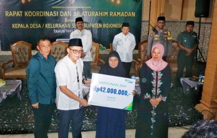 Dalam Rapat Koordinasi dan Silaturrohim dengan Desa/Kelurahan di Bojonegoro Zona 4 ini, Pj Bupati Bojonegoro didampingi Sekda dan Kepala Cabang BPJS Ketenagakerjaan menyerahkan uang santunan dengan nominal sebesar Rp 42 juta kepada Ibu Samsuri.