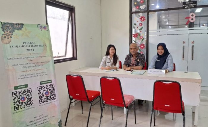 SURABAYATODAY ID, SURABAYA – Pemkot Surabaya siap mengawal Tunjangan Hari Raya (THR) 2024. Melalui Dinas Perindustrian dan Tenaga Kerja (Disperinaker) Surabaya, kini telah dibuka posko pengaduan THR, Jumat (22/3). Posko pengaduan THR itu berada di kantor Disperinaker Jalan Penjaringan Asri nomor 36 Surabaya.