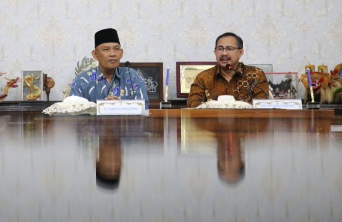 SURABAYATODAY ID, SURABAYA – Pemkot Surabaya menerima kedatangan Penjabat (Pj) Bupati Magetan Hergunadi beserta jajaran Pemerintah Kabupaten (Pemkab) Magetan di ruang sidang Wali Kota Surabaya, Kamis (28/3). Kedatangan mereka untuk menandatangani kerjasama Pembangunan Daerah antara Pemkot Surabaya dengan Pemkab Magetan.