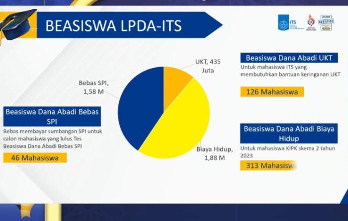 Selain beasiswa KIP-K, ITS juga memiliki Beasiswa Lembaga Pengelola Dana Abadi ITS (LPDA-ITS). Beasiswa tersebut terbagi tiga kategori, yaitu Beasiswa Dana Abadi Bebas Sumbangan Pengembangan Institusi (SPI) yang di tahun 2023 lalu diberikan kepada 46 mahasiswa dengan total nominal sebesar Rp 1,58 miliar, Beasiswa Dana Abadi Bantuan Uang Kuliah Tunggal (UKT) untuk 126 mahasiswa ITS dengan total sebesar Rp 435 juta, dan Beasiswa Dana Abadi Biaya Hidup sebesar Rp 1,88 miliar untuk 313 mahasiswa KIP-K skema 2. Sehingga total anggaran beasiswa yang telah dikucurkan oleh LPDA-ITS hingga 2023 tercatat sebesar Rp 3,895 miliar.