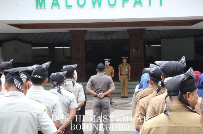 SURABAYATODAY.ID, BOJONEGORO – Kompak memakai kebaya dan udeng Samin, para pegawai di lingkup Pemerintah Kabupaten Bojonegoro, baik ASN maupun non ASN, mengikuti apel pagi, Senin (22/4). Pakaian tradisional dan udeng Samin ini dalam rangka memperingati Hari Kartini.