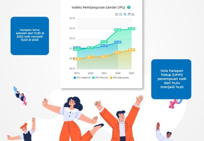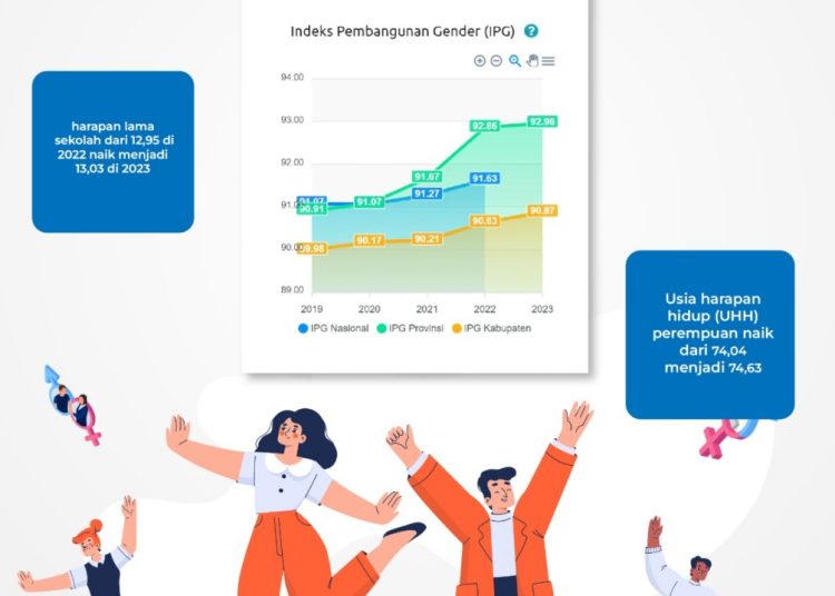 Pada tahun 2023 komponen IPG perempuan yang berada di atas laki-laki adalah usia harapan hidup dan harapan lama sekolah. Untuk usia harapan hidup (UHH) perempuan naik dari 74,04 menjadi 74,63, sedang harapan lama sekolah dari 12,95 di 2022 naik menjadi 13,03 di 2023. Sedang komponen rata-rata lama sekolah dan pengeluaran perkapita masih berada di bawah laki-laki.