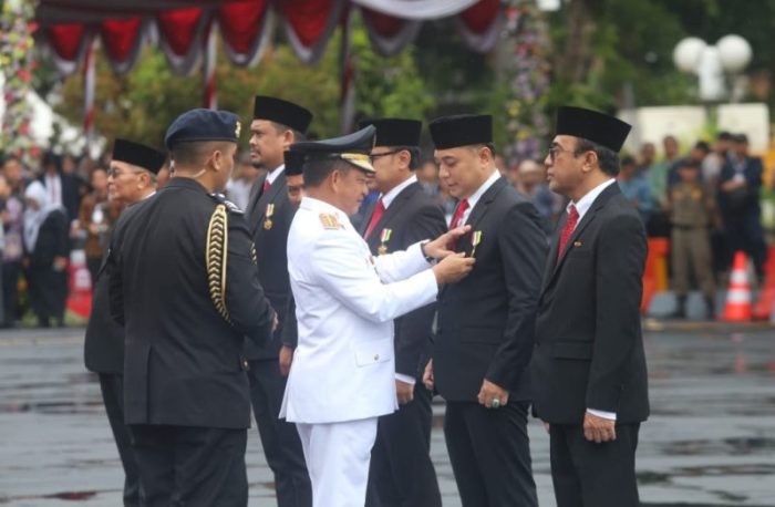 Pada kesempatan itu, Wali Kota Surabaya Eri Cahyadi bersama 13 kepala daerah lain di Indonesia, menerima penyematan tanda kehormatan Satyalancana Karya Bhakti Praja Nugraha.