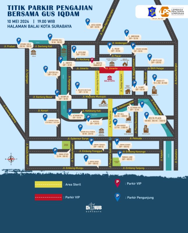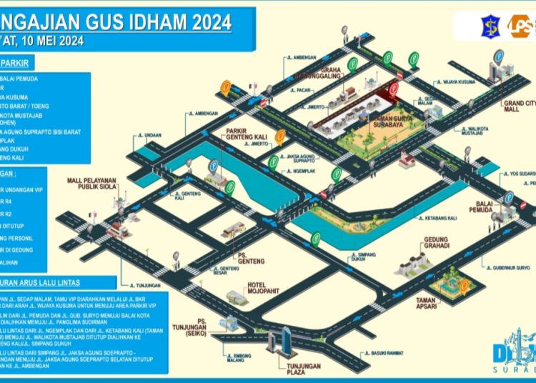 SURABAYATODAY ID, SURABAYA – Pemerintah Kota (Pemkot) Surabaya melalui Dinas Perhubungan (Dishub) Kota Surabaya menyiapkan skema pengalihan arus lalu lintas hingga titik-titik parkir pada saat acara pengajian akbar bersama KH Agus Muhammad Iqdam Kholid atau Gus Iqdam di Taman Surya Balai Kota Surabaya, Jumat (10/5). Pengajian akbar dalam rangka menyambut Hari Jadi Kota Surabaya (HJKS) ke-731 bersama Gus Iqdam ini didukung oleh Lembaga Penjamin Simpanan (LPS).