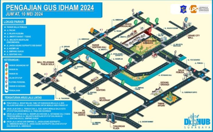 SURABAYATODAY ID, SURABAYA – Pemerintah Kota (Pemkot) Surabaya melalui Dinas Perhubungan (Dishub) Kota Surabaya menyiapkan skema pengalihan arus lalu lintas hingga titik-titik parkir pada saat acara pengajian akbar bersama KH Agus Muhammad Iqdam Kholid atau Gus Iqdam di Taman Surya Balai Kota Surabaya, Jumat (10/5). Pengajian akbar dalam rangka menyambut Hari Jadi Kota Surabaya (HJKS) ke-731 bersama Gus Iqdam ini didukung oleh Lembaga Penjamin Simpanan (LPS).