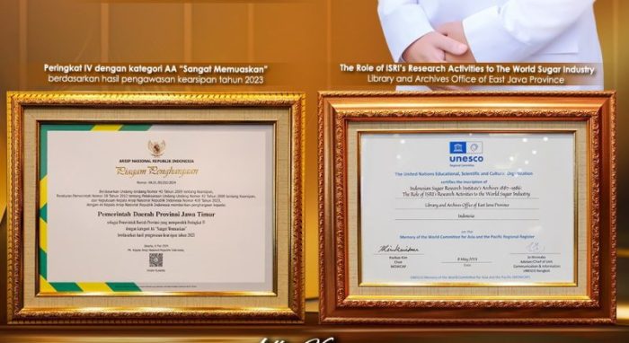 Adapun penghargaan yang diserahkan, pertama yakni Anugerah Khasanah Arsip Pusat Penelitian Perkebunan Gula Indonesia (P3GI) “Indonesian Sugar Research Institute’s Archives 1887 – 1986 Period: The Role of ISRI’s Activities to the World Sugar Industry” sebagai _Memory of the World Committee for Asia and the Pasific Regional Register (MOWCAP)_ Tahun 2024.