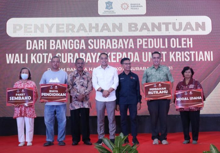 SURABAYATODAY ID, SURABAYA – Pemkot Surabaya memberikan bantuan sembako, biaya pendidikan, modal usaha, hingga perbaikan rumah tidak layak huni (rutilahu) kepada jemaat nasrani Oikumene, di Graha Sawunggaling, Jumat (7/6). Bantuan tersebut disalurkan kepada jemaat nasrani Oikumene melalui Bangga Surabaya Peduli (BSP).