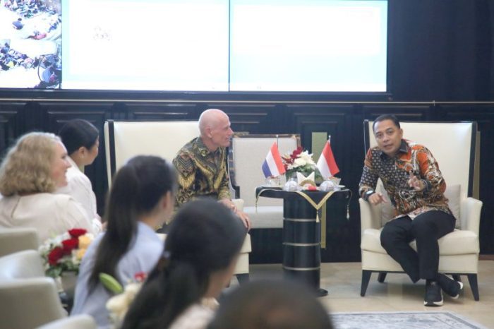 SURABAYATODAY.ID, SURABAYA – Wali Kota Surabaya Eri Cahyadi menerima kunjungan Duta Besar (Dubes) Belanda untuk Indonesia, Lambert Grijns, di ruang kerja Walikota Surabaya, Senin (29/7). Dalam kesempatan tersebut, keduanya membahas sejumlah peluang kerjasama, di antaranya revitalisasi gedung Singa di kawasan Kota Lama Surabaya dan makam Peneleh.