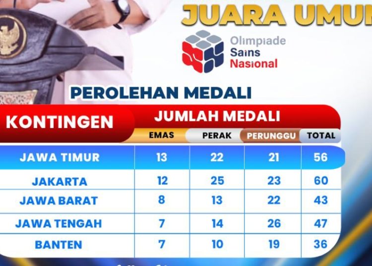 SURABAYATODAY ID, SURABAYA – Jawa Timur berhasil merebut kembali predikat juara umum Olimpiade Sains Nasional (OSN) Tahun 2024 yang digelar oleh Pusat Prestasi Nasional Kementerian Pendidikan Kebudayaan Riset dan Teknologi (Kemendikbudristek) RI di Jakarta.