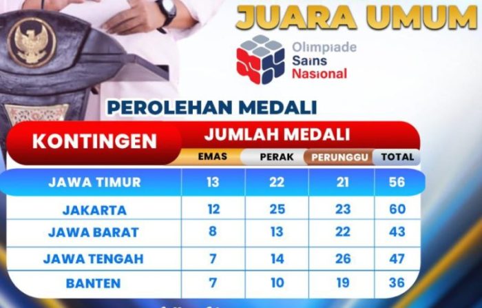 SURABAYATODAY ID, SURABAYA – Jawa Timur berhasil merebut kembali predikat juara umum Olimpiade Sains Nasional (OSN) Tahun 2024 yang digelar oleh Pusat Prestasi Nasional Kementerian Pendidikan Kebudayaan Riset dan Teknologi (Kemendikbudristek) RI di Jakarta.