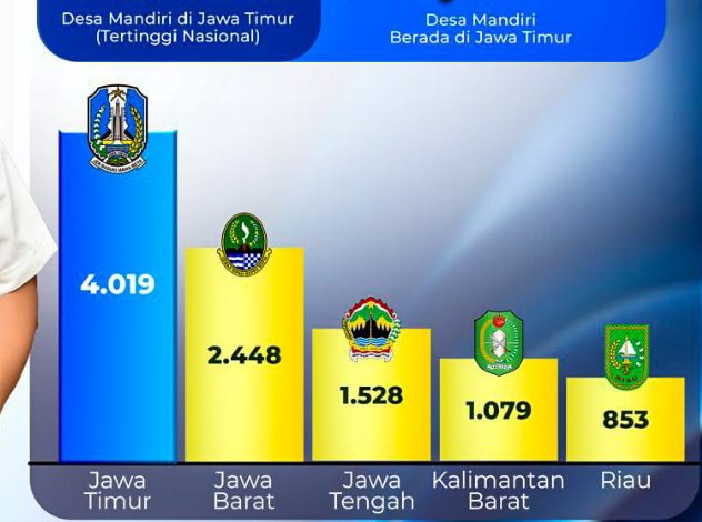 Lebih lanjut dijelaskan, di bawah Jatim, ada Provinsi Jawa Barat di urutan kedua sebanyak 2.448 desa mandiri, disusul Jawa Tengah 1.528 Desa Mandiri, Kalimantan Barat dengan 1.079 desa mandiri dan Riau di urutan keempat dengan 853 desa mandiri.