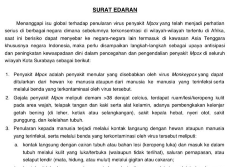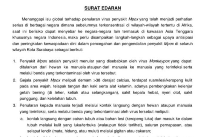 SURABAYATODAY ID, SURABAYA – Wali Kota Surabaya Eri Cahyadi menerbitkan Surat Edaran (SE) nomor 400.7.7.1/18341/436.7.2/2024 tentang Peningkatan Kewaspadaan Dini terhadap Risiko Penyebaran Penyakit Mpox. Hal ini menjadi upaya gerak cepat Pemerintah Kota (Pemkot) Surabaya dalam menanggapi isu global terhadap penularan virus penyakit Mpox.