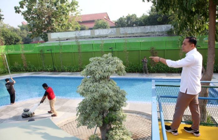 SURABAYATODAY ID, SURABAYA – Wali Kota Surabaya Eri Cahyadi meninjau proses revitalisasi Kolam Renang Jambangan, Jalan Ketintang Madya VII, Rabu (11/9) pagi. Ia mengatakan revitalisasi sudah 100 persen dan siap diresmikan di bulan ini.