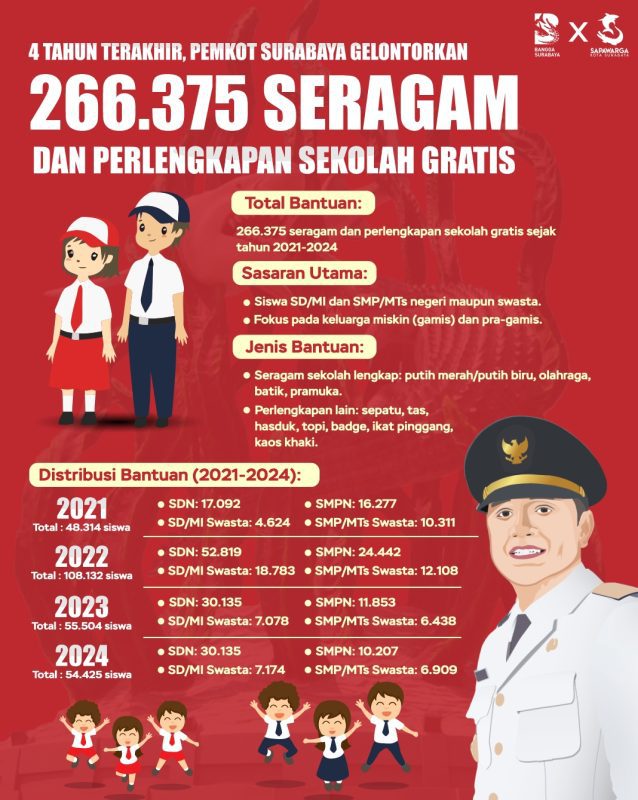 Dalam empat tahun terakhir, Pemerintah Kota (Pemkot) Surabaya menggelontorkan bantuan berupa seragam dan perlengkapan sekolah secara gratis kepada 266.375 siswa. Program ini dimulai sejak tahun 2021, dengan sasaran utama siswa dari jenjang SD/MI dan SMP/MTs negeri maupun swasta yang berasal dari keluarga miskin (gamis) maupun pra-gamis di Kota Pahlawan.