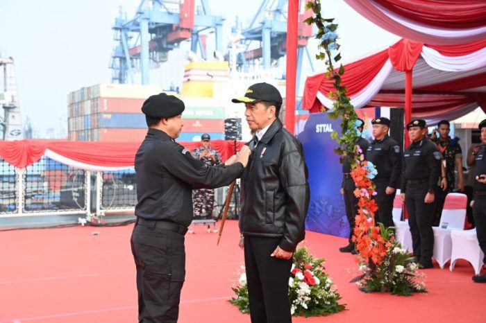 SURABAYATODAY.ID, SURABAYA – Presiden Republik Indonesia Joko Widodo menerima Brevet Kehormatan Hiu Kencana, Sabtu (28/9). Penyematan dilakukan oleh Panglima TNI Jenderal TNI Agus Subiyanto di geladak KRI dr. Radjiman Wedyodiningrat-992.