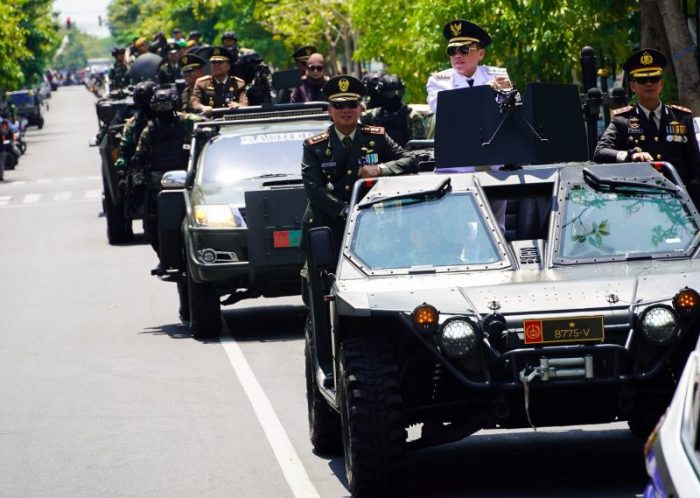 SURABAYATODAY.ID, BOJONEGORO – Upacara peringatan HUT ke-79 TNI di Alun-Alun Kota Bojonegoro berlangsung khidmat, sekaligus meriah, Sabtu (5/10). Selain beragam demonstrasi ketangkasan para Babinsa Kodim 0813 Bojonegoro diperagakan, di momen tersebut juga dilakukan penyerahan hadiah lomba cerdas cermat wawasan kebangsaan tingkat SD dan SMP, lomba PBB tingkat SLTP dan SLTA sederajat, penyaluran bantuan sosial, serta penyerahan hadiah kepada Babinsa terbaik diajang Babinsa Award tahun 2024.