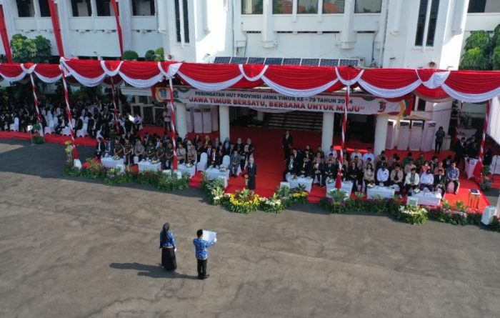 SURABAYATODAY.ID, SURABAYA – Pemerintah Kota (Pemkot) Surabaya menggelar upacara peringatan Hari Ulang Tahun (HUT) ke-79 Pemerintah Provinsi Jawa Timur, di halaman Balai Kota Surabaya, Senin (14/10). Dalam kesempatan tersebut, Penjabat Sementara (Pjs) Wali Kota Surabaya Restu Novi Widiani, membacakan sambutan Penjabat (Pj) Gubernur Jawa Timur Adhy Karyono tentang kesiapan Jatim menjadi gerbang menuju Ibu Kota Nusantara (IKN) Baru.