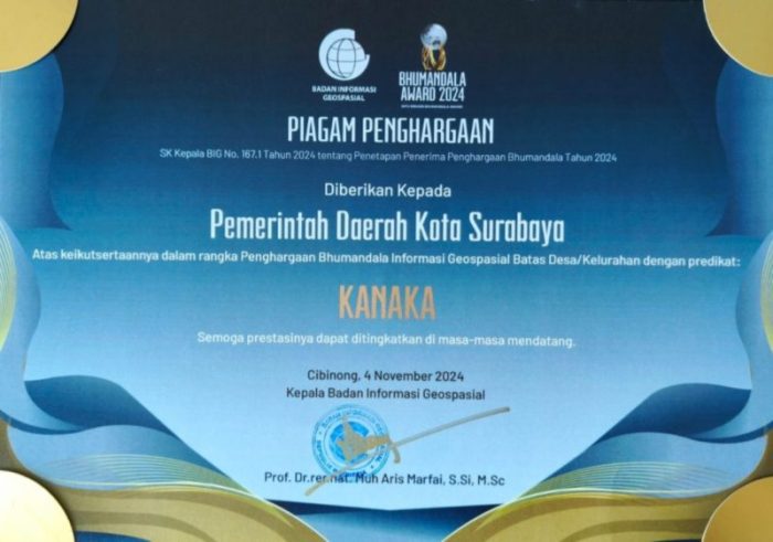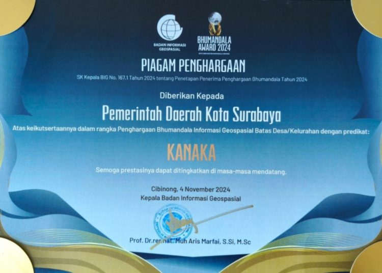 SURABAYATODAY.ID, SURABAYA – Pemerintah Kota (Pemkot) Surabaya berhasil meraih penghargaan bergensi dengan Predikat KANAKA (Emas) dari Badan Informasi Geospasial (BIG) untuk kategori penyelenggaraan Bhumandala Informasi Geospasial batas desa dan kelurahan Terbaik Tingkat Pemerintah Daerah (Pemda) Kota Se Indonesia.