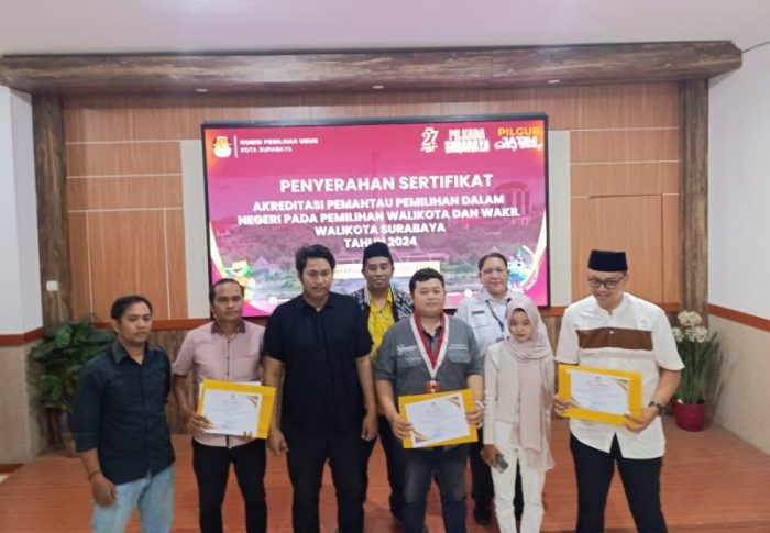 SURABAYATODAY.ID, SURABAYA – KPU Kota Surabaya memberikan sertifikat akreditasi terhadap empat pemantau Pemilihan Wali Kota dna Wakil Wali Kota Surabaya. Sertifikat diberikan setelah keempat pemantau menjalani verifikasi terhadap syarat dokumen yang disampaikan. Selanjutnya, pemantau bisa melakukan kerja pemantauannya dalam tahapan Pilkada 2024.