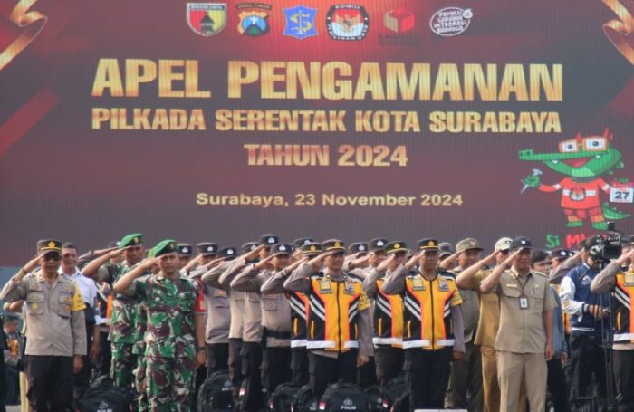 SURABAYATODAY.ID, SURABAYA – Forum Koordinasi Pimpinan Daerah (Forkopimda) Kota Surabaya menggelar “Apel Pengamanan” di Surabaya Expo Center, Jalan Kusuma Bangsa, Sabtu (23/11) pagi. Apel pengamanan ini bertujuan memastikan kesiapan personel dalam pelaksanaan Pilkada Serentak 2024.