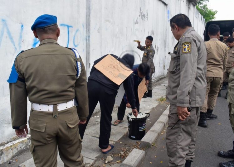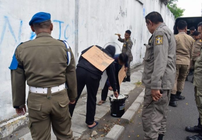 “Kami sanksi sosial dengan melakukan pengecatan ulang. Kami beri kuas, serta cat berwarna putih, lalu petugas kami juga mendampingi mereka saat melakukan pengecatan,” kata Mudita.