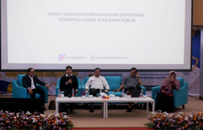 SURABAYATODAY.ID, SURABAYA – Pusat Kajian Transformasi Masyarakat dan Budaya Digital Fakultas Ilmu Sosial dan Ilmu Politik (FISIP) Universitas Pembangunan Nasional (UPN) Veteran Jawa Timur menggelar diskusi publik bertajuk kotak kosong dan demokrasi dalam Big Data, Senin (25/11). Acara yang digelar di Gedung Kuliah Bersama (GKB) 1 itu menghadirkan sejumlah pakar komunikasi politik untuk membahas fenomena kotak kosong. Hasilnya, mereka sepakat untuk mengusulkan threshold atau ambang batas ditiadakan atau dihapus.