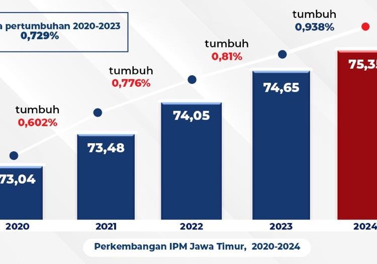 Lebih lanjut, Adhy menyampaikan, berdasarkan data BPS Jatim, pertumbuhan IPM di Jatim sejak tahun 2020-2023 mengalami rata-rata pertumbuhan sebesar 0,729 persen poin. Masing-masing, tahun 2020 sebesar 73,04 persen, tahun 2021 sebesar 73,48 persen, tahun 2022 sebesar 74,05 persen dan tahun 2023 sebesar 74,65 persen.