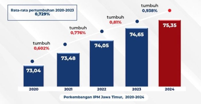 Lebih lanjut, Adhy menyampaikan, berdasarkan data BPS Jatim, pertumbuhan IPM di Jatim sejak tahun 2020-2023 mengalami rata-rata pertumbuhan sebesar 0,729 persen poin. Masing-masing, tahun 2020 sebesar 73,04 persen, tahun 2021 sebesar 73,48 persen, tahun 2022 sebesar 74,05 persen dan tahun 2023 sebesar 74,65 persen.