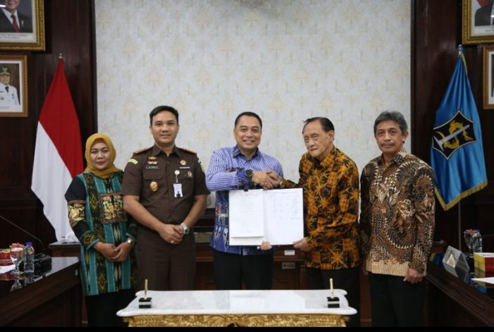 SURABAYATODAY ID, SURABAYA – Pemerintah Kota (Pemkot) Surabaya dan Yayasan Wijaya Kusuma melakukan penandatanganan kesepakatan atau Memorandum of Understanding (MoU) tentang penyerahan, pengamanan dan pemanfaatan aset yang berada di Jalan Jagir Wonokromo No.112, Surabaya. Kesepakatan tersebut dilakukan dengan pendampingan notaris dan disaksikan Kepala Kejaksaan Negeri (Kejari) Surabaya, Ajie Prasetya bertempat di ruang sidang wali kota, Kamis, (19/12).