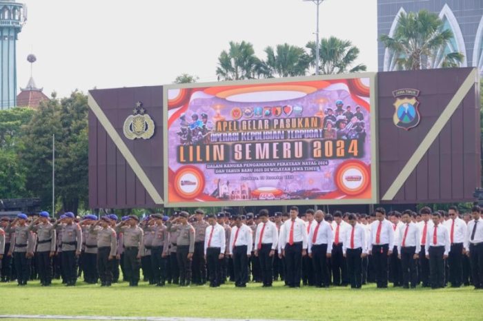 SURABAYATODAY.ID, SURABAYA – Apel Gelar Pasukan Operasi Lilin Semeru 2024 di Polda Jatim dilaksanakan, Jumat (20/12). Operasi ini merupakan langkah menyambut perayaan Natal 2024 dan Tahun Baru 2025.