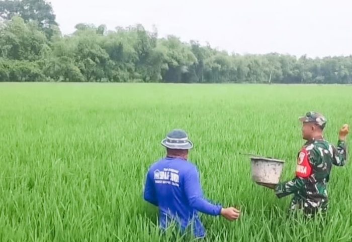 SURABAYATODAY.ID, BOJONEGORO – Mendukung program pemerintah di bidang ketahanan pangan, Babinsa Koramil 03/Balen Kodim 0813 Bojonegoro, Serda Jamari, mendampingi salah satu petani Desa Sarirejo merawat tanaman padi, Jumat (27/12). Kegiatan pendampingan tersebut dilakukan mulai dari penyiapan dan pengolahan lahan, pembibitan dan penanaman, perawatan hingga saat pemanenan tanaman.