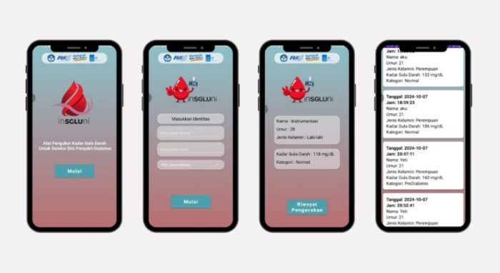 Tidak hanya itu, Insgluni juga dibekali dengan aplikasi berbasis android yang dapat dihubungkan dengan jaringan wi-fi. Aplikasi ini akan menerima dan menampung rekaman data pengujian kadar gula darah serta memberikan informasi kesehatan pengguna. Dengan demikian, pengguna dapat memantau dan mengontrol kadar gula darah secara teratur dan rutin.