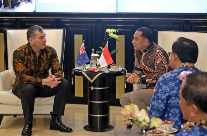 SURABAYATODAY.ID, SURABAYA – Wali Kota Surabaya Eri Cahyadi menyambut kunjungan Konsulat Jendral (Konjen) Australia di Surabaya, Glen Askew, Jumat (17/1). Pada pertemuan itu, Wali Kota Eri membahas berbagai hal, salah satunya upaya menjalin sister city dengan Australia.