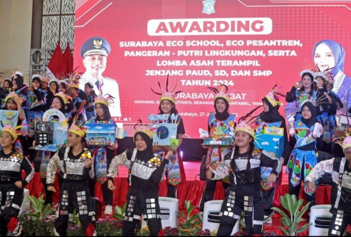 SURABAYATODAY.ID, SURABAYA -Pemkot Surabaya menggelar awarding eco school, eco pesantren, pangeran-putri lingkungan, serta lomba asah terampil untuk jenjang PAUD, SD, dan SMP se-Kota Pahlawan. Awarding tersebut diberikan kepada anak-anak PAUD, SD, dan SMP pemenang lomba eco school hingga pangeran-putri lingkungan tahun 2024.