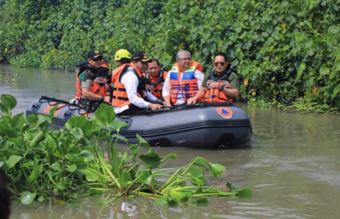 SURABAYATODAY.ID, SIDOARJO – Penjabat (Pj) Gubernur Jawa Timur Adhy Karyono melakukan susur sungai dan meninjau pembersihan eceng gondok, tanaman liar, sampah, dan material lain di sepanjang Sungai Kedungpeluk, Kecamatan Candi, Kabupaten Sidoarjo, Rabu (22/1). Ia menaiki perahu karet dan menyusui sungai dengan rute sepanjang 10,7 km.