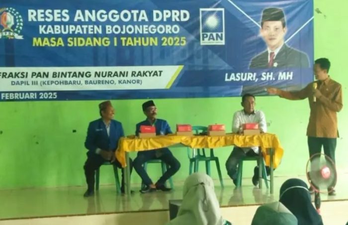 SURABAYATODAY.ID, BOJONEGORO – Anggota DPRD Kabupaten Bojonegoro, Lasuri dari Fraksi PAN Bintang Nurani Rakyat melaksanakan jaring aspirasi atau reses Masa Sidang I Daerah Pemilihan (Dapil) 3. Dapil ini meliputi Kecamatan Kanor, Baureno dan Kepohbaru. Sedangkan acara digelar di gedung serbaguna Desa Kanor, Kecamatan Kanor.