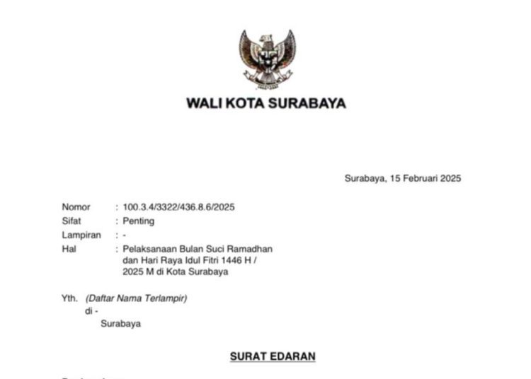 SURABAYATODAY.ID, SURABAYA – Pemkot Surabaya menerbitkan Surat Edaran (SE) nomor 100.3.4/3322/436.8.6/2025 tentang Pelaksanaan Bulan Suci Ramadan dan Hari Raya Idul Fitri 1446 H/2025 M. Surat Edaran tersebut ditandatangani Wali Kota Surabaya Eri Cahyadi, dibagikan kepada lurah, camat, ketua RT/RW, pengurus masjid/musala, lembaga sosial/keagamaan, hingga pengelola usaha di Kota Pahlawan.