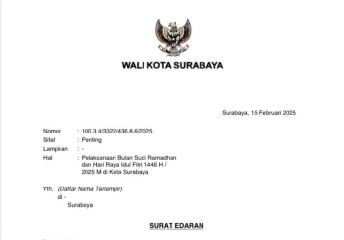 “Surat edaran tersebut dalam rangka menjamin keamanan, ketertiban dan ketentraman dalam pelaksanaan Ibadah Bulan Suci Ramadan dan Hari Raya Idul Fitri 1446 H/2025 M di Kota Surabaya,” terang Wali Kota Eri dalam Surat Edaran yang diterbitkan, Sabtu (15/2).