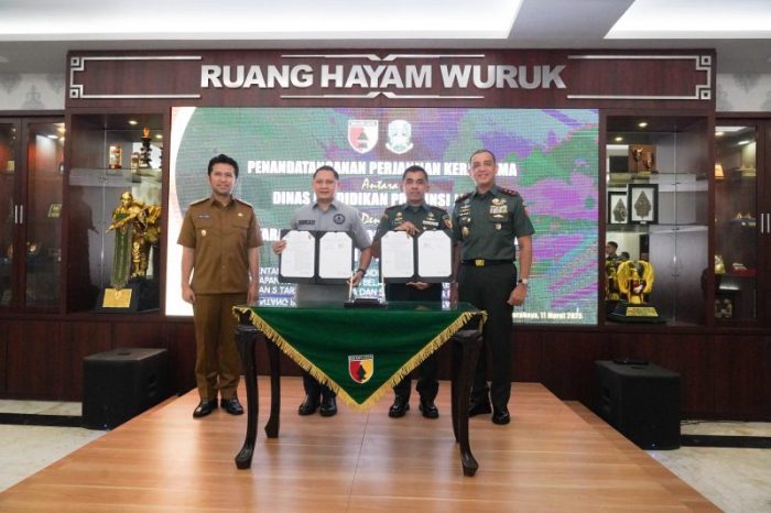 SURABAYATODAY.ID, SURABAYA – Pemerintah Jawa Timur melalui Dinas Pendidikan melakukan perjanjian kerjasama dengan Kodam V/Brawijaya tentang bela negara dan kesamaptaan bagi para siswa SMAN Taruna, Selasa (11/3). Perjanjian tersebut ditandatangani oleh Kepala Dinas Pendidikan Jatim Aries Agung Paewai bersama Pangdam V/Brawijaya, Mayjen TNI Rudi Saladin.