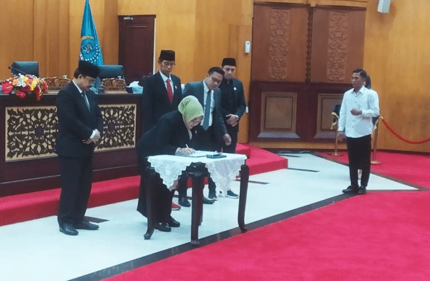 Penandatanganan berita acara pengesahan PD Rumah Potong Hewan menjadi Perseroda dalam rapat paripurna di DPRD Surabaya.