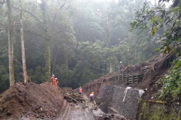 Perbaikan Jalan Sumber Brantas Jalur Pacet-Cangar yang  longsor pada 3 April 2025 lalu masih terus dikerjakan.