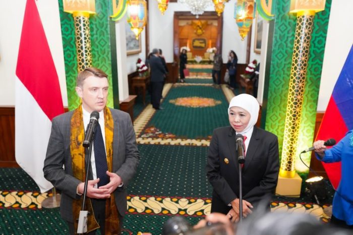 SURABAYATODAY.ID, SURABAYA – Gubernur Jawa Timur Khofifah Indar Parawansa menerima kunjungan Delegasi Provinsi Tomsk, Rusia di gedung Negara Grahadi Surabaya, Rabu (16/4) malam. Hadir sebagai ketua rombongan Wakil Gubernur Wilayah Tomsk Bidang Industri, Kebijakan Investasi, dan Hubungan Kepemilikan Vasiliy Potemkin yang juga didampingi oleh Wakil Gubernur Wilayah Tomsk Bidang Pengembangan Ilmiah dan Teknologi Liudmila Ogorodova.