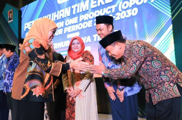 SURABAYATODAY.ID, SURABAYA – Gubernur Jawa Timur Khofifah Indar Parawansa mengukuhkan 16 orang anggota Tim Penguatan dan Pengembangan Eko-Tren OPOP Jawa Timur masa bakti 2025-2030 di Harris Hotel & Conventions Gubeng, Surabaya, Rabu (16/4).