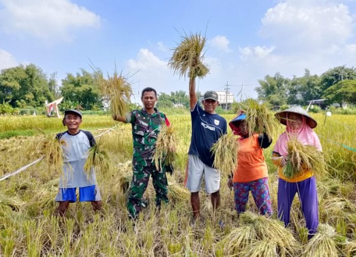 Dalam upaya mendukung program ketahanan pangan nasional, Babinsa Kelurahan Sumur Welut, Sertu Wisnu dari Koramil 0830/21 Lakarsantri, turut mendampingi warga dalam kegiatan panen padi di wilayah binaannya.